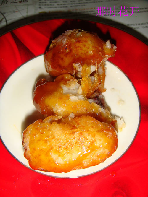 这是一道很好的菜肴,可惜被我做失败了。 总结了一下,小枣的胚子做的太大,再就是没把外壳炸硬就捞出沥油了。所以拔丝的时候连外壳一起都拔起来了。