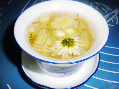 菊花,金银花,茉莉花均少许,泡水作茶饮,可清热解毒,适用于防治风热感冒、咽喉肿痛、痈疮等,常服更可降火,有宁神静思的效用