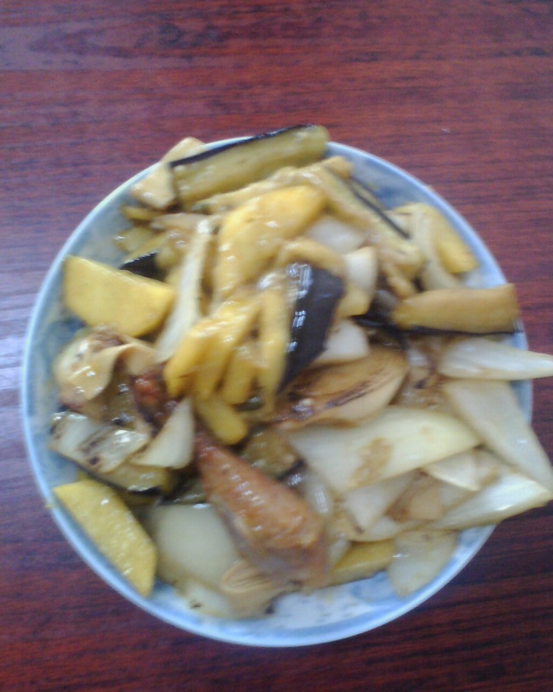 及以下步骤:锅中热油,八分热放入切好的茄子条,炸至金黄色,注意一定油温要够 不然的话会很难吃的。 将土豆条炸至金黄色。 锅中热油,八分热放入切好的茄子条,炸至金黄色,注意一定油温要够 不然的话会很难吃的。 将土豆条炸至金黄色。 锅中热油,八分热放入切好的茄子条,炸至金黄色,注意一定油温要够 不然的话会很难吃的。 将土豆条炸至金黄色。 锅中热油,八分热放入切好的茄子条,炸至金黄色,注意一定油温要够 不然的话会很难吃的。 将土豆条炸至金黄色。 锅中加少许油将圆葱入锅,我比较喜欢清淡 所以没加其他调料,依次加入茄子土豆条,翻炒,加盐、花椒粉,加入少许水。 加入调好的湿淀粉水,勾芡,起锅 就成了,家里还有个鸡腿 就一起放里了 呵呵。