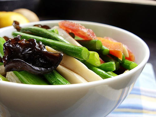 3,也可以先将木耳,鲍菇焯水,然后再炒。即可大大缩短炒制时间。