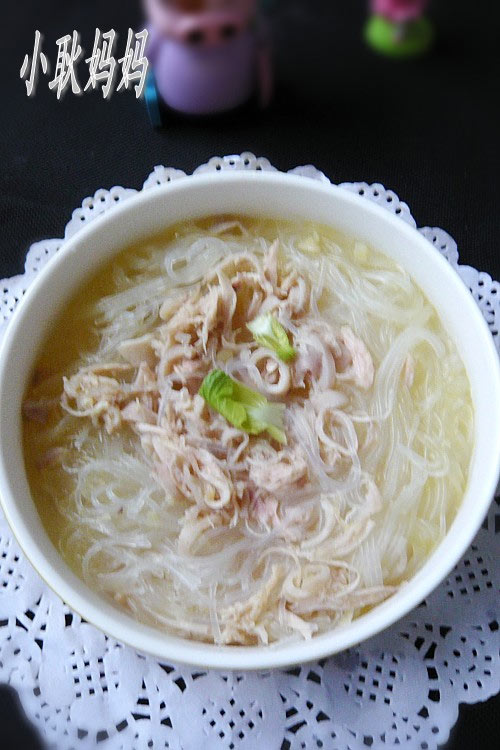 及以下步骤:稍微翻炒十几秒加入鸡汤烧开。 改小火炖十分钟左右加入粉丝。 再次烧开加盐,鸡精调味就可以。 加点水,料酒烧开焯烫一遍。 粉丝提前用清水泡开。 熟鸡肉同样撕开成丝状,粉丝切成段,生姜剁成沫。 油热后煸香姜末,加入乌仔和鸡肉。 稍微翻炒十几秒加入鸡汤烧开。 改小火炖十分钟左右加入粉丝。 再次烧开加盐,鸡精调味就可以。