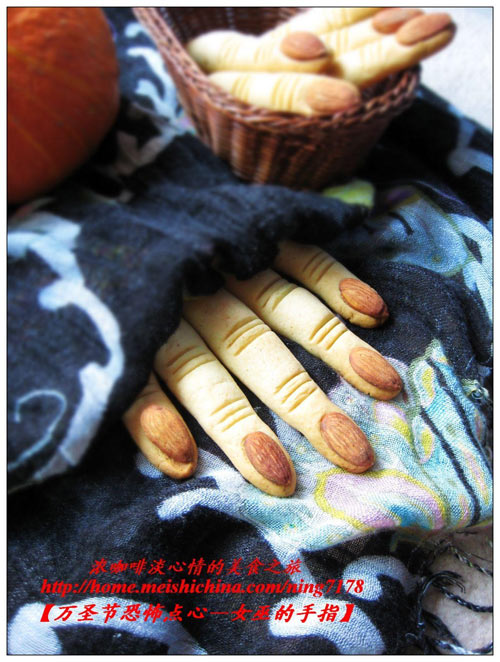 说起来不怕你笑话,万圣节是哪一天俺根本就不知道,只是看到网上大家都在热火朝天的准备点心,才知道老外的‘鬼节’要到了,本来也想着做个小南瓜之类的精致小点心凑个热闹,无意间看到一个mm做的这款恐怖又逼真的【女巫手指饼干】,虽然看起来有点怕怕滴,不过真的很拉风。方子是俺常用的一款奶油饼干的方子,做起来比较顺手,造型借鉴mm滴,照片拍的不是很满意,没有营造出恐怖的感觉,亲们多多发挥想象力哈。 纠结了好半天,要不要把这恐怖手指发上来,因为看起来实在有点不舒服的感觉,和俺以往的日志风格完全不搭界,这手指会不会把俺给毁了