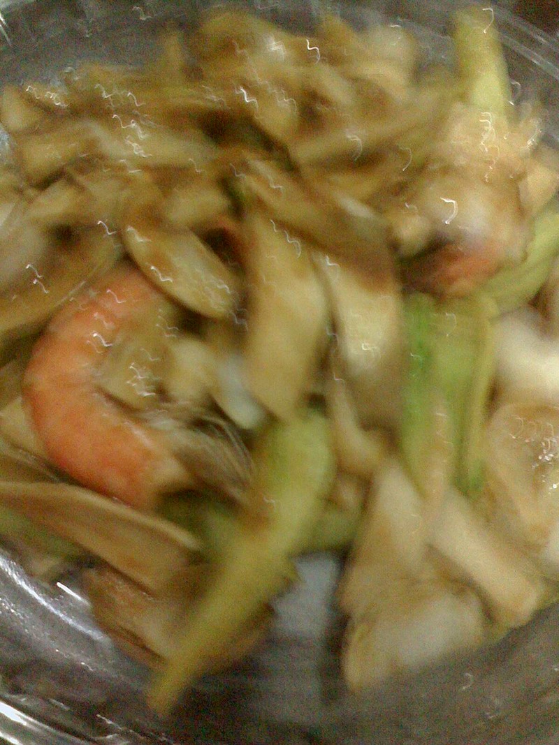 看了会跳舞的老太做的蚝油炒杏鲍菇,于是从冰柜里拿了四只虾,杏鲍菇有点少就又加了两根黄瓜和鲜百合,味道还不错,因为有红烧汁就没再加味精什么的调料。因为不爱吃特别嫩的虾,就多炒了一会儿,但黄瓜和百合都是最后加的,还是很鲜嫩的。