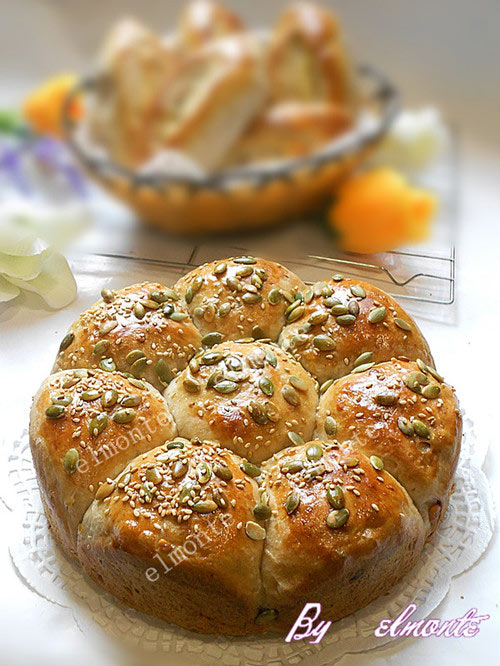 及以下步骤:卷成橄榄形,接口捏紧。 烤箱预热约28c-30c度左右,放入1碗开水,把面包放入二次发酵。 二次发酵至2倍大。 把面包拿出,烤箱预热350f/180c度。蛋糕模的面包刷上鸡蛋液,撒上南瓜子和芝麻。 橄榄形的面包刷上鸡蛋液,用利刀在中间划一刀,挤上美奶滋(蛋黄酱)。 放入预热好的烤箱。 烤20分钟,拿出橄榄形面包。 蛋糕模面包继续烤10分钟即可。 奶香味加上核桃香味,很好吃呢。 奶香味加上核桃香味,很好吃呢。