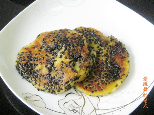 及以下步骤:用手搓成饼,粘上黑芝麻。 放入平底锅,两面煎透即可。 地瓜洗净,去皮,切厚片。 隔水蒸熟。 用勺子捣碎。 加些牛奶搅拌均匀。 加些白糖,搅拌均匀。 加入糯米粉,搅拌均匀。 用手搓成饼,粘上黑芝麻。 放入平底锅,两面煎透即可。