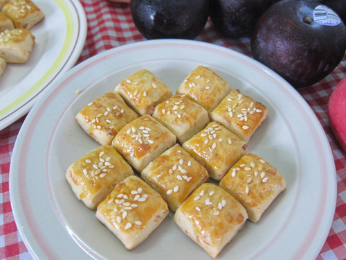 及以下步骤:用块湿布覆盖着静置20分钟。 拿出压成四方形或长方形的形状。 厚度约1公分厚就行了。 把它先切成1寸阔长条状。 再切成正方形小方块状。 均匀滴排在谱着涂有奶油锡纸的烘架上。 取出鸡蛋中的蛋黄备用。 刷上一层蛋黄液在每一粒的饼干表面。 再均匀滴在每粒饼干上撒上一点白芝麻。 我滴味道淡淡的,只有一点点咸味哦!