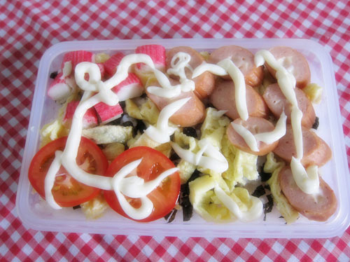 及以下步骤:再铺上一层鸡蛋。 香肠,蟹棒也整齐滴排上。 再加上2片番茄片。(或你喜欢滴蔬菜) 挤上适量的沙拉酱在上面。 “撒寿司”饭盒就好咯!! 再铺上一层鸡蛋。 香肠,蟹棒也整齐滴排上。 再加上2片番茄片。(或你喜欢滴蔬菜) 挤上适量的沙拉酱在上面。 “撒寿司”饭盒就好咯!!