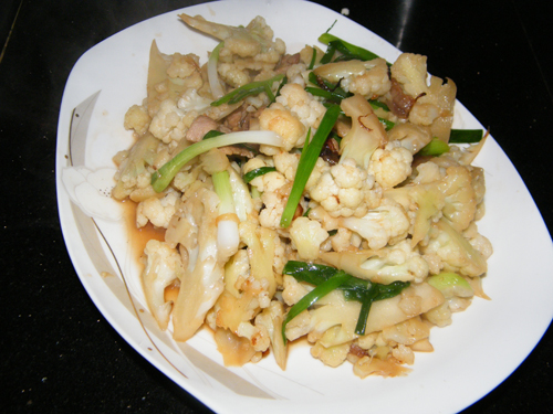 菜花炒肉只是个家常菜,却不是一个好做的菜。切菜、切肉、榨油、中途还洗一次锅,火候控制要比较到位,这个才是对耐心的极大考验。这个菜市两年前跟一个湖南朋友学的,其实是个湘菜。但即使不放辣椒,味道也很不错,是道下饭的好菜。