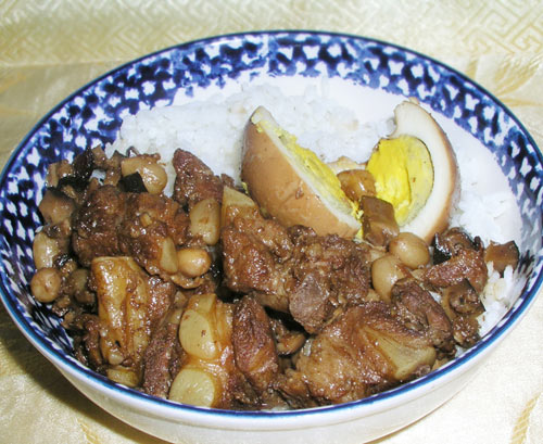 正宗的台式卤肉是将上好的五花肉切小丁,加上香料和鸡蛋一起炖到肉烂汤浓方可出锅。吃的时候浇在饭上,加一只卤蛋,两棵青菜就是一份滋味浓郁的美餐。 自己在家做虽不正宗,但这种家的味道实在是外边吃不到的。卤肉饭有一道重要的配料是油葱酥。就是将小干葱切片后拆散成小圈,用油慢慢的炸干,晾干后用擀面杖擀碎。在家做不用这么讲究。 做卤味一定要焖足火候,使肉中的油融入汤中,滋味更浓。我这次用的是肋排做的,个人认为比五花肉好吃。