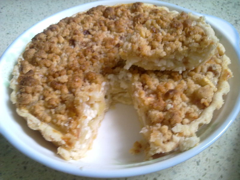4、上面的东西都准备好以后把馅料倒入1步骤的派皮内。最后均匀的撒上酥粒即可。烤箱200度预热。烤40分钟。我家里的小烤箱温度不均匀烤的颜色有点深。建议家用的烤箱烘烤到20分钟左右盖上锡纸。