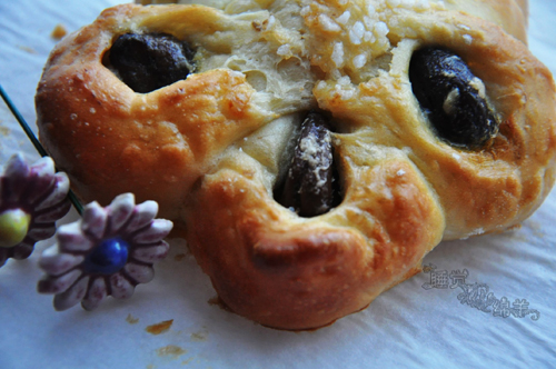 及以下步骤:取一个面团,擀成合适的长椭圆形。取煮好的栗子5个,并排、无空隙地摆在面团中间。 用面团将栗子包起来,收口封好,然后翻面,将收口朝下。用刀,手感觉着,在栗子中间切开面团,几乎切到最底,但是不要切断。 将面团拉开来。 将右端在上,左端在下(或者反过来),两端交叉。 将面团拧好,所有栗子面朝上。成为一朵五瓣花瓣的花。撒上面粉,轻轻搭上塑料袋,在17度环境下发酵2小时。 2小时后,刷上蛋液,撒上糖粒。 放入预热好的烤箱,180度,约13分钟,表面金黄了,即可。 将面团拧好,所有栗子面朝上。成为一朵五瓣花瓣的花。撒上面粉,轻轻搭上塑料袋,在17度环境下发酵2小时。 2小时后,刷上蛋液,撒上糖粒。 放入预热好的烤箱,180度,约13分钟,表面金黄了,即可。