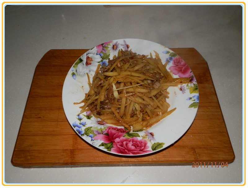 5、肉丝6、7成熟时放入姜丝一起煸炒。