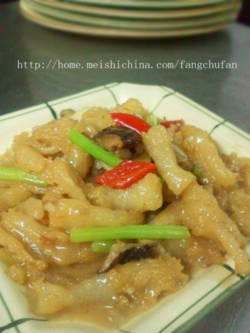 及以下步骤:调入调料转小火焖至收汁。 最后放入芹菜段淋入少许芝麻油炒匀即可。 猪脚筋洗净备用。 水发香菇、蒜头、红尖椒、姜切角,瘦肉剁末,芹菜切段。 猪脚筋飞水捞干。 热油锅,炒香配料(芹菜除外) 加入适量的高汤。 倒入捞干的猪脚筋。 调入调料转小火焖至收汁。 最后放入芹菜段淋入少许芝麻油炒匀即可。