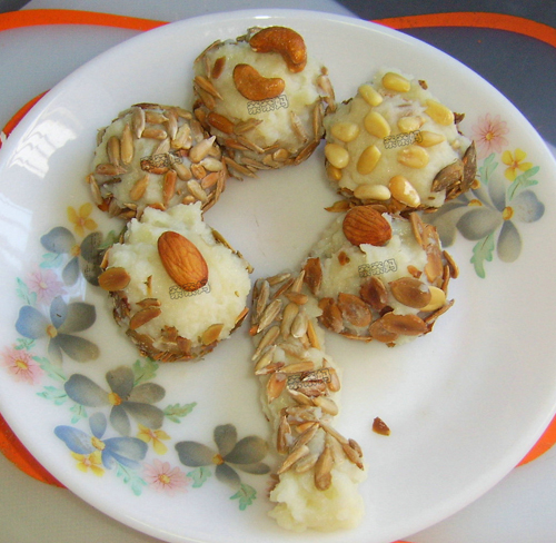 ~~ 土豆泥做的,外面滚上香香的瓜子仁(有葵花仔、奶油味的和绿茶味的南瓜仔),还有松子仁(可都是我一颗一颗亲手剥出来的,剥了好几个晚上呢) 土豆的营养挺好,我就喜欢蒸了整个儿的给亲亲吃、挺香的~~ 小时候亲亲午睡起来的点心常常就是它了。这回蒸了换个吃法,土豆泥细腻香甜、配了果仁了香脆,挺奶油的。 只是沾了果仁最好马上吃,否则久了果仁受潮了就不香脆了。 边玩边吃孩子最喜欢了啊~~~