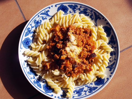 如果把做好的酱与煮好的面,放在一起再炒一下,也很美味。煮意面时,要放一些盐在水里,不要煮得太软,否则就没有“咬劲”了。
