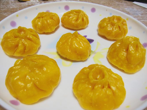 很久没有吃奶黄包了!很想吃啊!正好!阿姨拿了个南瓜来家里!我家又没有人吃南瓜!想起就做成包子馒头或者南瓜饼吃好了!这次做的包子!做得很小!一口一个!很可爱呢!一共做了18个!刚出炉就被爸爸妈妈解决10个!剩下的带去办公室又被同事都解决完了!o(∩_∩)o~开心!!