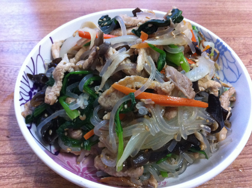 及以下步骤:拌好了。颜色怎么样,看着就很有胃口。 猪瘦肉切长7厘米左右宽1厘米的条 粉条用水泡软 蘑菇用手掰成细条 木耳,胡萝卜,洋葱分别切丝 菠菜洗净把叶子和杆中间用刀切开,稍后过热水烫一下,用凉水冷却,控去水分备用,菠菜先下菠菜杆后下叶子,让其熟的程度一致。 粉条煮断生,过凉水空去水分,蘑菇用开水过,凉水冲凉,用手撰干去除水分,和烫好的菠菜备用 猪瘦肉切长7厘米左右宽1厘米的条 粉条用水泡软 蘑菇用手掰成细条 木耳,胡萝卜,洋葱分别切丝 菠菜洗净把叶子和杆中间用刀切开,稍后过热水烫一下,用凉水冷却,控去水分备用,菠菜先下菠菜杆后下叶子,让其熟的程度一致。 粉条煮断生,过凉水空去水分,蘑菇用开水过,凉水冲凉,用手撰干去除水分,和烫好的菠菜备用 锅放油 待温度热后放入肉条翻炒变色,放入切好的胡萝卜丝 洋葱丝 木耳丝 ,烫好的蘑菇条继续翻炒,放入适量的盐(千万不要盐放太多,因为在后面拌的时候还要放盐),一小勺生抽,千万不要放多,否则就影响菜的颜色 ,待蔬菜变软后放入菠菜快速翻炒,马上出锅 炒好的菜放入一个稍大点的盆里,摊开晾凉,以免菠菜变色 粉条用剪刀剪几下,锅放入色拉油,待油温热后放入粉条快速滑动,炒至粉条表面没有水分,而且油亮光滑的时候出锅,将其倒入炒好的菜盆内。 多放些芝麻,香油,适量的盐,用手上下翻动拌匀,千万不可用力搅拌,否则味道一定会变得很多。 拌好了。颜色怎么样,看着就很有胃口。