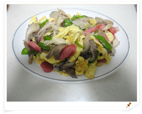 鸡蛋(适量) / 大葱(适量) / 尖椒(适量) / 平菇(适量) / 台湾烤肠(适量)