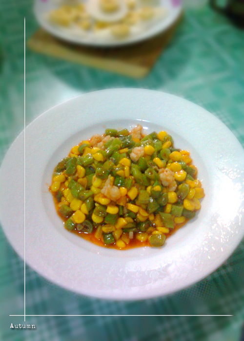 及以下步骤:甜玉米取粒,四季豆切小丁,虾仁切丁。 油锅热后,下四季豆炒片刻。 甜玉米取粒,四季豆切小丁,虾仁切丁。 油锅热后,下四季豆炒片刻。 甜玉米取粒,四季豆切小丁,虾仁切丁。 油锅热后,下四季豆炒片刻。 下玉米粒继续炒。 玉米和四季豆炒六七成熟后,下虾仁。 加少量糖、盐、蚝油、番茄酱,少量料酒。 加水没过食材,中火烧至剩少量汤汁,加一点味精出锅。