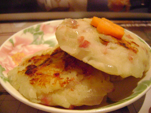 及以下步骤:把培根洋葱末倒入土豆泥中,再加入少许盐和胡椒粉,搅拌均匀,然后在手心搓成小圆球,压扁,放入油热的锅,大火煎制。 待两面金黄即可出锅。 土豆对切开,入蒸锅20分钟左右,视大小而定。 培根2片,洋葱半个。 培根洋葱切末。 锅入少许油,放入培根翻炒,有微微出油即可。 洋葱末倒入培根,继续翻炒至洋葱变色,出锅待用。 土豆去皮压成泥。 把培根洋葱末倒入土豆泥中,再加入少许盐和胡椒粉,搅拌均匀,然后在手心搓成小圆球,压扁,放入油热的锅,大火煎制。 待两面金黄即可出锅。