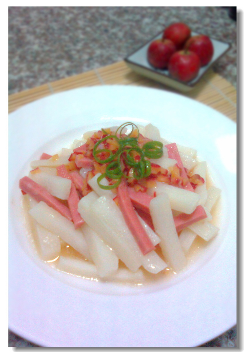 及以下步骤:把山楂末倒入汤中,小火烧至山楂肉透明,加味精。 把烧好的山楂汤浇至山药火腿肠上。 点缀上葱丝即可。 锅内油热后,入火腿肠稍炒。 加山药翻炒片刻,加两小勺糖,加适量盐。 加水没过食材,中火加热。 烧至剩少量水份时,捞起山药和火腿肠。 把山楂末倒入汤中,小火烧至山楂肉透明,加味精。 把烧好的山楂汤浇至山药火腿肠上。 点缀上葱丝即可。