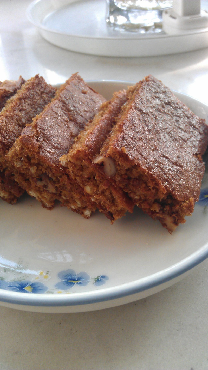 及以下步骤:将冷却后的蛋糕取出,翻面,撕去烤纸;冷却后再翻过来,正面朝上,用蛋糕刀切去四边(可省略),然后分切成小块即可。 我用的全麦粉是德国全麦粉,里面含有燕麦碎片,吃起来更香. 牛奶、色拉油、酱油倒入小碗中,隔60度左右热水,边加热边搅拌,至碗内液体温度至37度时关火,隔热水保温备用; 取一盆,打入鸡蛋,倒入糖粉、盐; 用打蛋器低速打至半发时,加入蜂蜜和香草精,改用告诉打发至舀起面糊时可以呈柱状流下,痕迹不会马上消失的状态时,取出打蛋器,倒入过筛的高粉和全麦粉及核桃仁葡萄干,改用橡皮刮刀从下往上翻拌均匀; 将牛奶、油与酱油的混合液倒入盆中,快速混合均匀; 将面糊倒入模具中,墩出大汽泡; 放入预热好的烤箱,160度,上下火,中层,30分钟左右; 将冷却后的蛋糕取出,翻面,撕去烤纸;冷却后再翻过来,正面朝上,用蛋糕刀切去四边(可省略),然后分切成小块即可。 我用的全麦粉是德国全麦粉,里面含有燕麦碎片,吃起来更香.