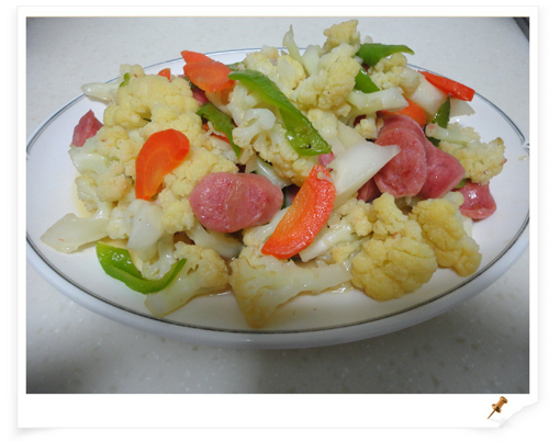 5、翻炒片刻后加入烤肠炒一会,然后再加入焯好的菜花翻炒。
