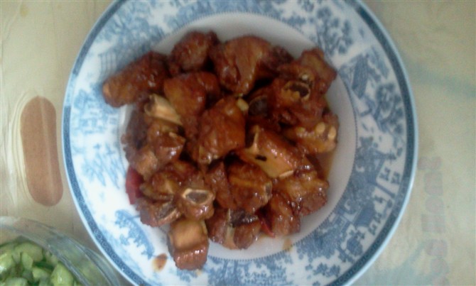 3、锅内放油,七分热下锅,炒至金黄色,放于乐可(以没过排骨为宜),盖上锅盖,中火焖8-10分钟左右,打开锅盖,如还有汤汁,可开大火收汁,最后不停的翻炒,让色泽更金黄,最后,快起锅的时候,倒入柠檬汁即可。