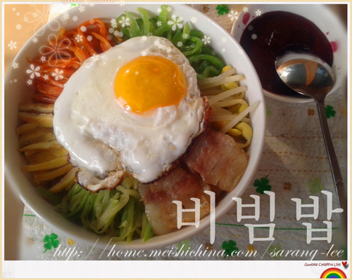 拌饭(비빔밥)是最家常的朝鲜料理,可以用石锅焖饭再拌上各式蔬菜(饭店常用),而家里自己做更多的是用米饭直接拌上各种菜的,总之统称拌饭!男友说朝族更常见的是家里剩下什么菜就拌什么,所以当他看到我做的拌饭后直说从没想过自己能在家里吃到这么豪华的拌饭~ 男友姓李,朝族大姓,故而谓之李府拌饭。没用石锅,我们的那个石头家伙太小,焖出来的饭不够我俩分的^^