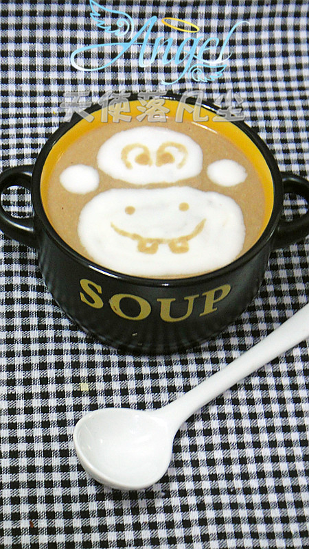 及以下步骤:将酸奶插上管挤出大小不一的四个圆形。 画上眼睛、嘴巴、牙齿。 成品图。 将高压锅里加适量的水放入大枣、花生、核桃。 煮20分钟后出锅稍晾凉。 将大枣去皮,煮透的大枣很容易去皮。 将去皮的大枣和核桃、花生连同煮好的汤水一起放入料理机搅拌成细腻的糊状。 将酸奶插上管挤出大小不一的四个圆形。 画上眼睛、嘴巴、牙齿。 成品图。