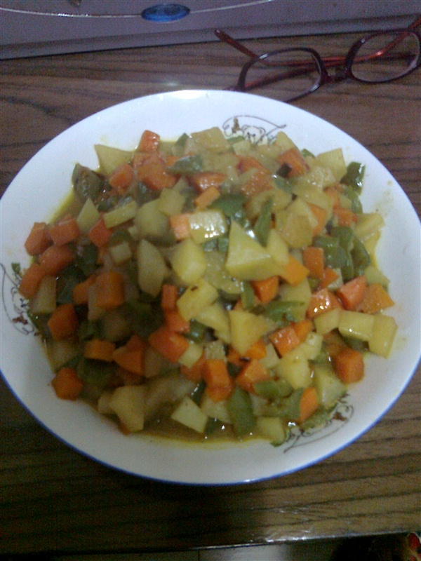 及以下步骤:土豆、胡萝卜、青椒切丁; 油锅烧热,放葱姜油锅稍炸一下,接着倒入切好的三丁,翻炒; 土豆、胡萝卜、青椒切丁; 油锅烧热,放葱姜油锅稍炸一下,接着倒入切好的三丁,翻炒; 土豆、胡萝卜、青椒切丁; 油锅烧热,放葱姜油锅稍炸一下,接着倒入切好的三丁,翻炒; 土豆、胡萝卜、青椒切丁; 油锅烧热,放葱姜油锅稍炸一下,接着倒入切好的三丁,翻炒; 加入少许水、盐、糖、咖喱粉,炒匀,盖锅中火煮。 汤汁差不多收干,便可盛出食用~
