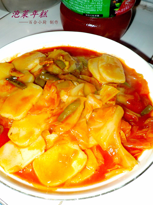 到超市买了年糕与泡菜,突发奇想,两者搭配做菜不知味道如何?于是,动手实践,果然,味道酸辣可口,喜欢的朋友,不妨试试。