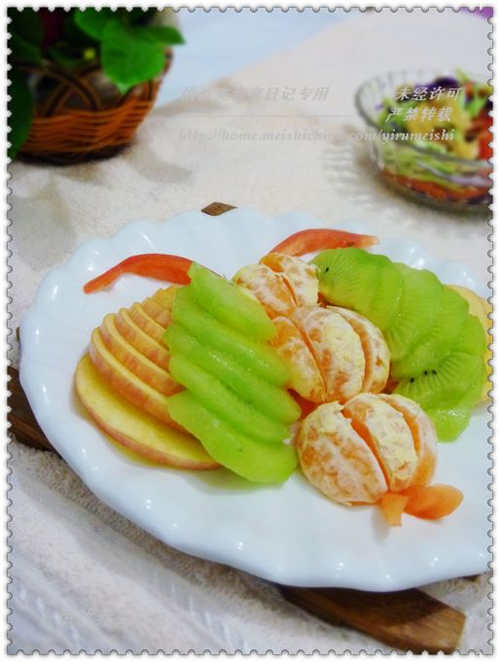 西红柿(两小片) / 苹果(小个一个) / 猕猴桃(小个一个) / 蜜桔(小个一个)