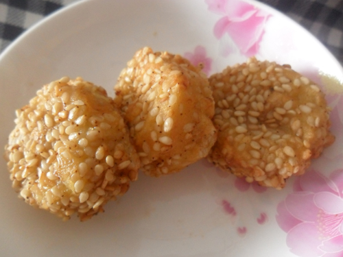 油(适量) / 鸡蛋(1个) / 面粉(100克) / 芝麻(适量)