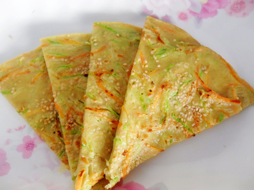 及以下步骤:西葫芦,胡萝卜刨成丝备用。 准备好原料西葫芦,胡萝卜,鸡蛋,面粉。 西葫芦,胡萝卜刨成丝备用。 准备好原料西葫芦,胡萝卜,鸡蛋,面粉。 西葫芦,胡萝卜刨成丝备用。 准备好原料西葫芦,胡萝卜,鸡蛋,面粉。 西葫芦,胡萝卜刨成丝备用。 把鸡蛋放在面粉中,放入西葫芦丝和胡萝卜丝,再放入适量盐,五香粉加适量的水搅拌成面糊。 电饼铛内放点油,倒入面糊摊平,然后再撒上适量芝麻。 一面煎好后翻个身,再将另一面煎黄就好了。
