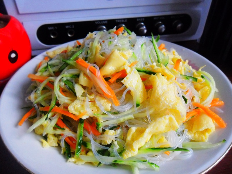 及以下步骤:粉丝在温水中浸泡半小时。 黄瓜和胡萝卜擦成丝。 粉丝在温水中浸泡半小时。 黄瓜和胡萝卜擦成丝。 粉丝在温水中浸泡半小时。 平底锅或电饼铛中抹适量油,倒入蛋液摊成较薄的鸡蛋饼然后铲成片 黄瓜和胡萝卜擦成丝。 把蒜放蒜臼里捣碎。 将油烧至8成热时浇至蒜泥上,加盐、醋或其他自己喜好的调料拌成料水。 然后把以上原料倒在一起调拌均匀即可。
