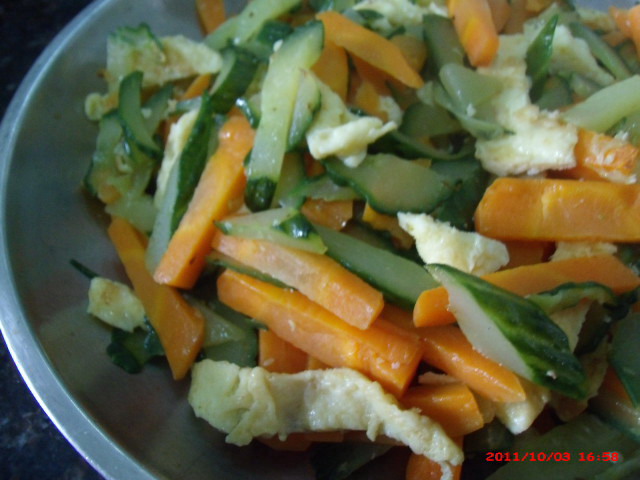 及以下步骤:准备好原材料 把黄瓜和萝卜切丝 准备好原材料 把黄瓜和萝卜切丝 准备好原材料 把黄瓜和萝卜切丝 将鸡蛋炒成蛋饼 将黄瓜与鸡蛋煮熟,下适量的盐 将黄瓜鸡蛋萝卜翻炒 盛出即可!!!!