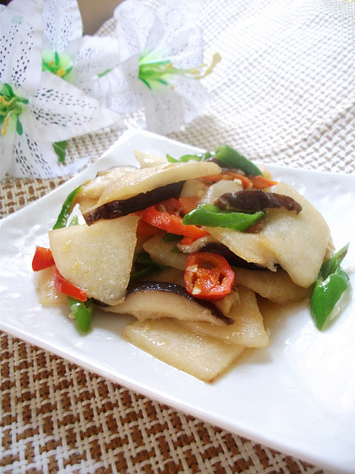 小时候很喜欢的一道菜,大了离了家乡就很少吃了,沙葛在广州这边,一般拿来煲汤或是做肉馅,所以当我第一次清炒出来,老公觉得很奇怪,这玩意居然也能拿来炒着吃,而且味道还相当不错呢。脆脆的,加了香菇,有股淡淡的香味,又有点微辣,很是下饭。