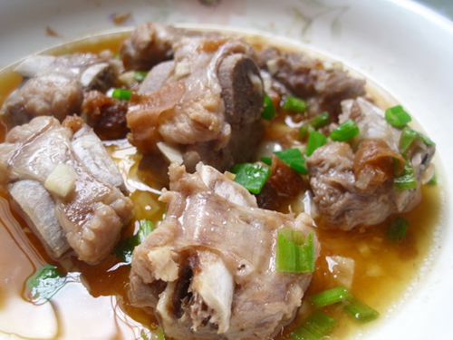 及以下步骤:排骨挑选中间段,洗净。 蒜头切成蒜蓉。 排骨挑选中间段,洗净。 蒜头切成蒜蓉。 排骨挑选中间段,洗净。 蒜头切成蒜蓉。 自家腌的酸梅。 往排骨上加入蒜蓉、少量酱油和两颗捏烂的酸梅及少量酸梅汁,搅拌均匀,放置腌30分钟入味。 腌好后,放在蒸架上,冷水锅开水蒸,蒸10分钟。 出锅前撒少量葱花,稍蒸半分钟即可。
