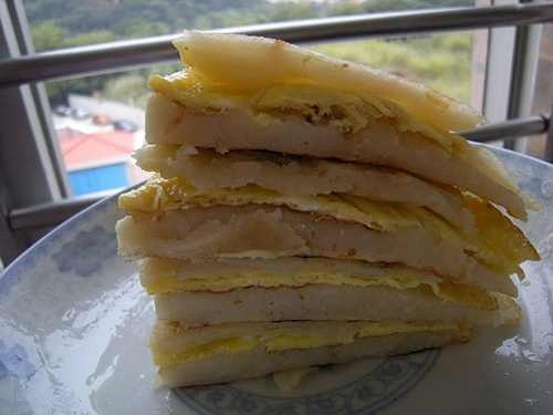 及以下步骤:煎熟切块即可。 面粉加水调成面糊,鸡蛋打散加盐。 平底锅热油舀入面糊煎成面饼,一面凝固时,盛出备用。 面粉加水调成面糊,鸡蛋打散加盐。 平底锅热油舀入面糊煎成面饼,一面凝固时,盛出备用。 下鸡蛋液煎鸡蛋饼。 蛋液凝固时,将面饼覆盖到鸡蛋饼上,面饼和鸡蛋饼重合,盛出备用。 锅中再煎面饼。 一面凝固时,将鸡蛋面饼覆盖到面饼上,有鸡蛋的一侧夹在中间。 煎熟切块即可。
