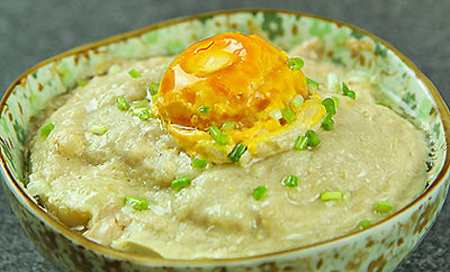 3、把咸蛋打入碗中的肉泥之上,然后入蒸锅。水开后放入 蒸15分钟,等肉收缩,与碗边分离,即可上桌。