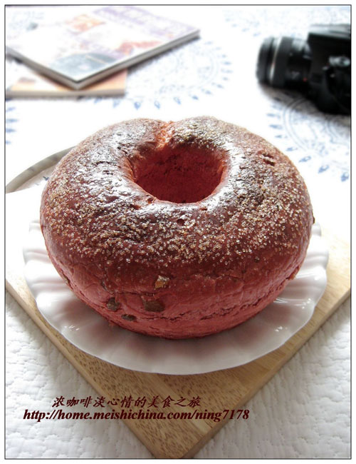 及以下步骤:松弛好后按扁,擀成长方形。 再卷成圆柱状。 两端合拢捏紧成环状。 在模具中薄薄的抹一层油。 将整形好的面团放入模具中(天使蛋糕模),盖上保鲜膜,放到温暖湿润处进行整形发酵(可在微波炉里放一杯开水,再将模具一同放入微波炉里进行发酵,水凉后再换一杯,直到面团发酵至满意为止)。 面团发酵至满模,表面刷上蛋液,撒上粗砂糖进行烤制。 两端合拢捏紧成环状。 在模具中薄薄的抹一层油。 将整形好的面团放入模具中(天使蛋糕模),盖上保鲜膜,放到温暖湿润处进行整形发酵(可在微波炉里放一杯开水,再将模具一同放入微波炉里进行发酵,水凉后再换一杯,直到面团发酵至满意为止)。 面团发酵至满模,表面刷上蛋液,撒上粗砂糖进行烤制。