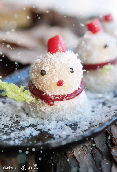 及以下步骤:澄粉,用开水烫面,揉匀;糯米粉,加冷水与白砂糖揉匀。 两团面粉加食用油,揉成一团,至光滑。 澄粉,用开水烫面,揉匀;糯米粉,加冷水与白砂糖揉匀。 两团面粉加食用油,揉成一团,至光滑。 澄粉,用开水烫面,揉匀;糯米粉,加冷水与白砂糖揉匀。 两团面粉加食用油,揉成一团,至光滑。 分割出一小块面团,加入红曲粉,揉匀。 分割面团并包入馅料(我用了现成的红豆沙馅儿)揉圆红色的面团搓成长条。 蒸熟后趁糯米丸表面湿润时均匀沾上椰蓉,即可食用。 我把两个球摞在一起红曲粉的面团绕在两个球中间做围巾,黑芝麻的面团做眼睛用了一个辣椒做帽子和鼻子白萝卜的小叶子做扫帚。