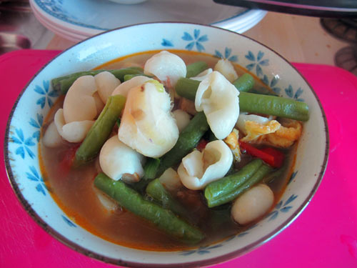 7、将炒好的肉丁和豆干倒入锅中与豆角同煮10分钟左右
