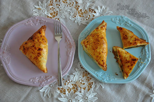 及以下步骤:炒好的菠菜等凉,与搅碎的kicherbsen、crème fraîche、芝麻酱、罗勒、卡宴胡椒、盐、胡椒搅拌均匀,成馅。如果这里太干燥,可以多加一点crème fraîche或者柠檬汁;如果水份太多,可以加些面包屑。 千层皮切成约8*8 cm大小的正方形,6块。每块上尽量多放馅。我做的馅,只多出来了两勺那么多的量。 包成三角形,封口处用蛋液粘好,用手压紧。最后刷上蛋液,撒上些甜椒粉。 放入预热好的烤箱,180度,约18分钟,即可。 锅里给橄榄油烧 ,加入洋葱、蒜和小米椒炒香,然后加入红甜椒,炒到变软。再加入芜荽粒,炒出香味。 然后加入菠菜,炒开。如果锅里有水份的话,要炒干。 炒好的菠菜等凉,与搅碎的kicherbsen、crème fraîche、芝麻酱、罗勒、卡宴胡椒、盐、胡椒搅拌均匀,成馅。如果这里太干燥,可以多加一点crème fraîche或者柠檬汁;如果水份太多,可以加些面包屑。 千层皮切成约8*8 cm大小的正方形,6块。每块上尽量多放馅。我做的馅,只多出来了两勺那么多的量。 包成三角形,封口处用蛋液粘好,用手压紧。最后刷上蛋液,撒上些甜椒粉。 放入预热好的烤箱,180度,约18分钟,即可。