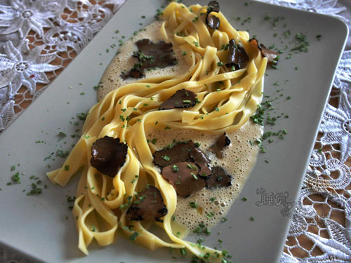 及以下步骤:搅拌均匀后,转中小火,慢慢煮到汁变得粘稠。 关火,然后加入1勺黄油,融到汁里去。用盐和胡椒调味。 将汁倒入一个高的容器。再加1勺烹饪奶油。 用搅拌棒,打成泡沫状。 这时候面差不多煮好了。过冷水,然后沥干,装盘。汁浇到面上。 这时候该主将松露出马了。因为家里不常吃这个,没有买专门削松露的刨子,所以买的已经切成薄片的松露。取1勺黄油融化,将松露趁热拌到黄油里去,这样可以很好地将松露的香发挥出来。将松露和黄油淋到面上,再撒些小葱葱花,即可。 将汁倒入一个高的容器。再加1勺烹饪奶油。 用搅拌棒,打成泡沫状。 这时候面差不多煮好了。过冷水,然后沥干,装盘。汁浇到面上。 这时候该主将松露出马了。因为家里不常吃这个,没有买专门削松露的刨子,所以买的已经切成薄片的松露。取1勺黄油融化,将松露趁热拌到黄油里去,这样可以很好地将松露的香发挥出来。将松露和黄油淋到面上,再撒些小葱葱花,即可。