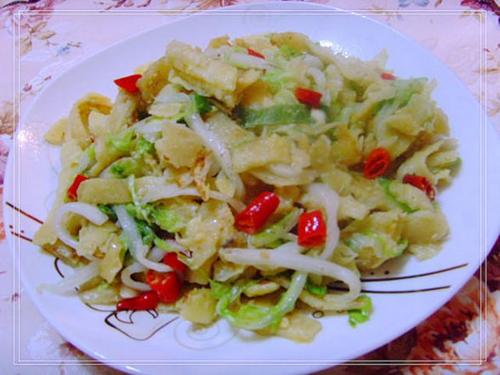 及以下步骤:红辣椒切小圈。 锅中倒油,待油8成热时放八角,再放入葱、姜、辣椒爆香。 倒入切好的白菜丝翻炒片刻。 再倒入用蛋液浸泡过的饼丝。 小炒一回后加盐、鸡精调味即可。 红辣椒切小圈。 锅中倒油,待油8成热时放八角,再放入葱、姜、辣椒爆香。 倒入切好的白菜丝翻炒片刻。 再倒入用蛋液浸泡过的饼丝。 小炒一回后加盐、鸡精调味即可。