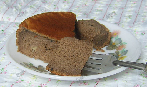 及以下步骤:四个蛋白分次加入65克糖,打到湿性发泡。 挖1/3打好的蛋白入拌好的可可蛋黄糊糊中,上下翻拌均匀。 拌好面糊倒回蛋白盆中,小心的上下翻拌均匀。 电饭内胆铺油纸,倒入翻拌好的面糊。 震出大气泡(这里要罗嗦下:记得有写过、可还是不断有人问我怎样震出大气泡?酱紫滴:就是台板上铺块毛巾,手提锅的两侧,平行上移再垂直下落,说白罗就是砸几下锅呗) 老规矩:按下‘煮饭’跳过‘保温’后,保温约半小时,再次按下‘煮饭’等跳过‘保温’后再保温约半小时。 又被懒惰修剪的油纸抠了一圈腰出来。 那天下午做的,想等亲亲下课了回来点心的,时间来不及了,急着接亲亲就放在锅里没倒出来,回家倒出来发现有些受潮的模样啊~~ 看看内部组织~~口感么跟酸奶蛋糕没什么搭介咧,倒是有戚风的细致、轻柔呢。 看看内部组织~~口感么跟酸奶蛋糕没什么搭介咧,倒是有戚风的细致、轻柔呢。