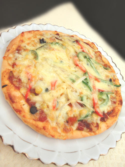 盐(3/4小匙) / 色拉油(1大匙 10克) / 洋葱(1/2个) / 猪肉(200克) / 西红柿(250克) / 黑胡椒(2克) / 番茄酱(70克) / 牛奶(适量) / 细砂糖(10克) / 橄榄油(10克) / 青红椒(50克) / 玉米粒(200克) / 小苏打(少许) / 大蒜末(1小匙) / 罗勒叶(4片) / 杏鲍菇(20克) / cook100烤肉料(10克) / 比萨草(适量) / 即溶酵母粉(适量) / 比萨奶酪丝(200克)