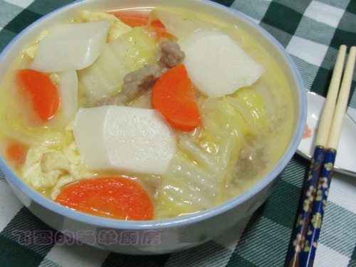 1、大白菜洗净,取适量;水磨年糕用两根;鸡蛋一个;瘦肉少许(加少许盐和薯粉料酒已经预处理),胡萝卜用三分之一根。